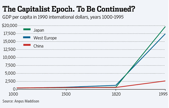 Maddison describes 1820 till 1950 as the “capitalist epoch.” He means that admiringly. The tools of capitalism unlocked the knowledge created until then. What came to be called “economic growth” gave more people jobs that lifted them and their families from the muck of joblessness and poverty. Maddison also noted that much of the world did not participate in the capitalist epoch. No wonder they revolt now.