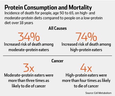 In the 50-to-65 age range, “subjects in the high protein group had a 74% increase in their relative risk of all-cause mortality, and were more than four times as likely to die of cancer when compared with those in the low-protein group,” the researchers reported.