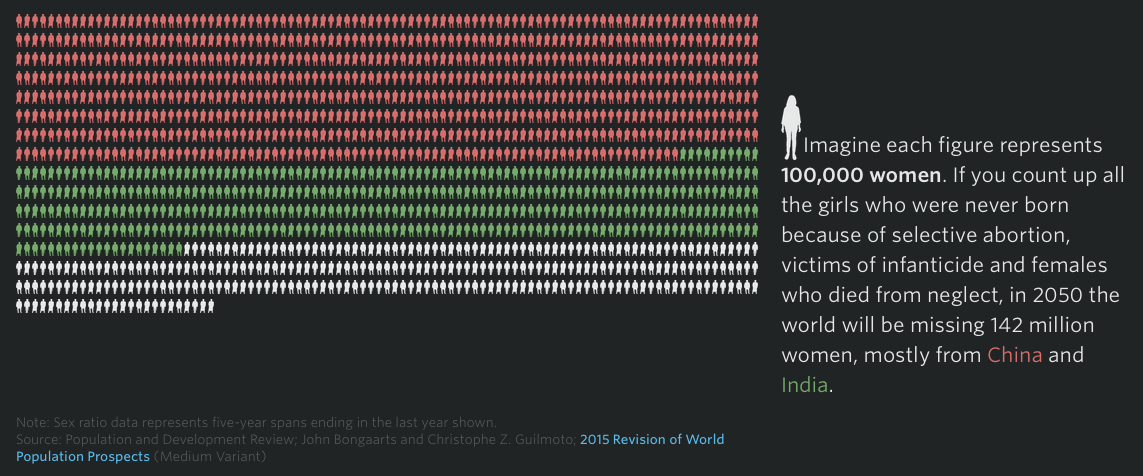 Imagine each figure represents 100,000 women. If you count up all the girls who were never born because of selective abortion, victims of infanticide and females who died from neglect, in 2050 the world will be missing 142 million women, mostly from China and India.