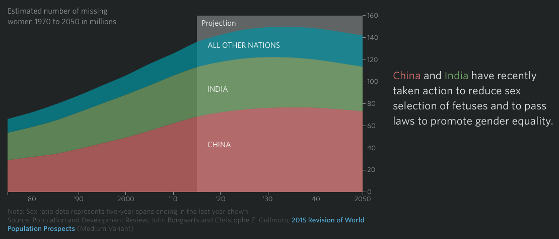 In June of 2015, the Population Council, a New York City-based research organization, published a study saying there were 88 million missing women world-wide in 1990, when Mr. Sen wrote his article, and that there were 126 million missing in 2010, roughly half of them attributable to prenatal sex selection. Of those, more than 112 million were in Asia.