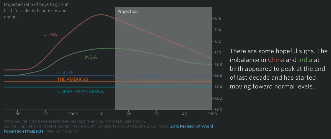 There are some hopeful signs. The imbalance in China and India at birth appeared to peak at the end of last decade and has started moving toward normal levels.