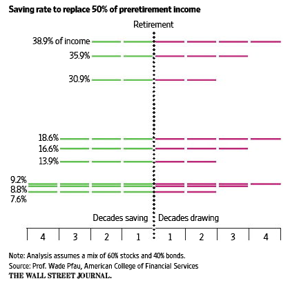 Mr. Pfau recommends that someone with 30 years until retirement and a portfolio with 60% in stocks and 40% in bonds save about 16.6% of their annual income a year.