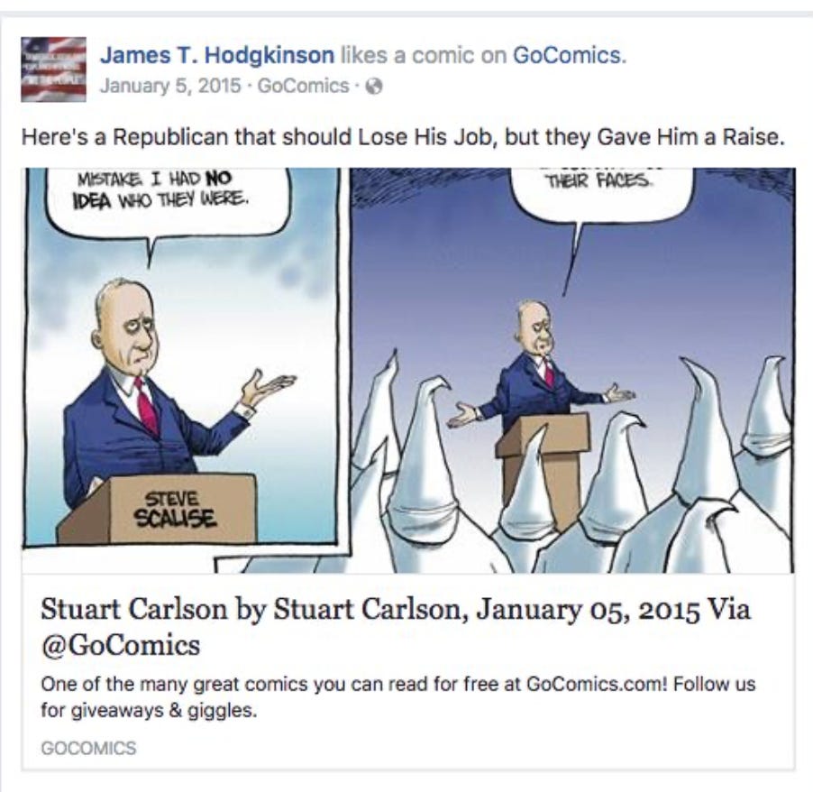 While consuming this strident and increasingly rage-driven Trump-era, anti-GOP media diet, Hodgkinson “joined several anti-GOP Facebook groups, including ‘Terminate The Republican Party’; ‘The Road to Hell Is Paved With Republicans’;, and ‘Join The Resistance Worldwide!!'” Two of his consuming beliefs were that Trump-era Republicans were traitors to the United States and fascist white nationalists. In 2015, he had posted a cartoon depicting Scalise — the man he came very close to murdering — as speaking at a gathering of the KKK.