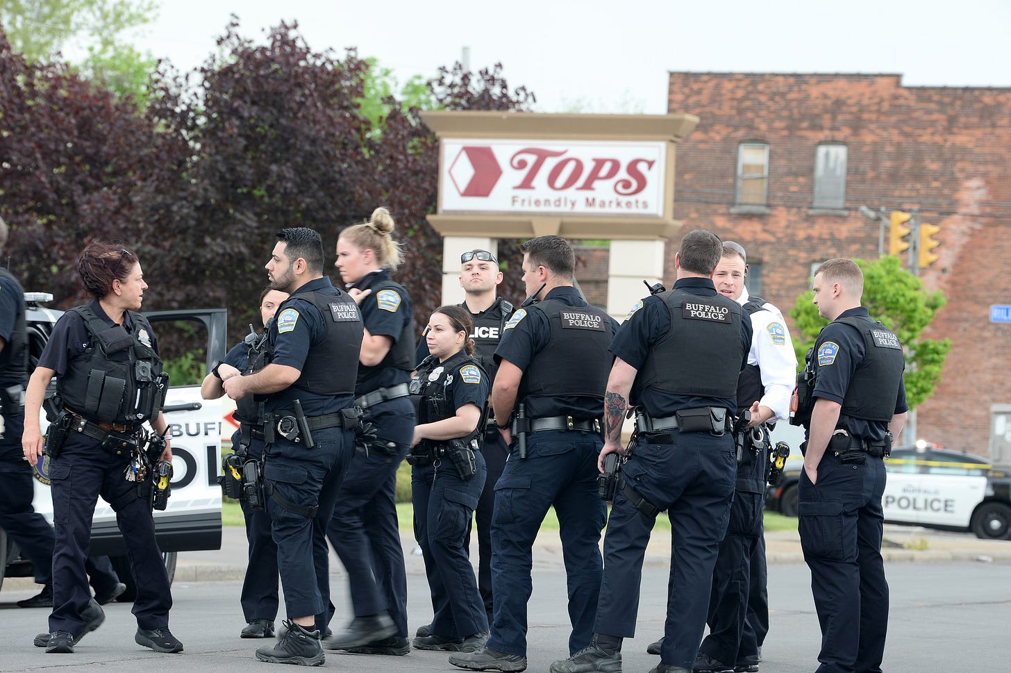 Buffalo Police on scene at a Tops Friendly Market on May 14, 2022 in Buffalo, New York. At least 10 people were killed after a mass shooting at the store with the shooter in police custody. (Photo by John Normile/Getty Images)