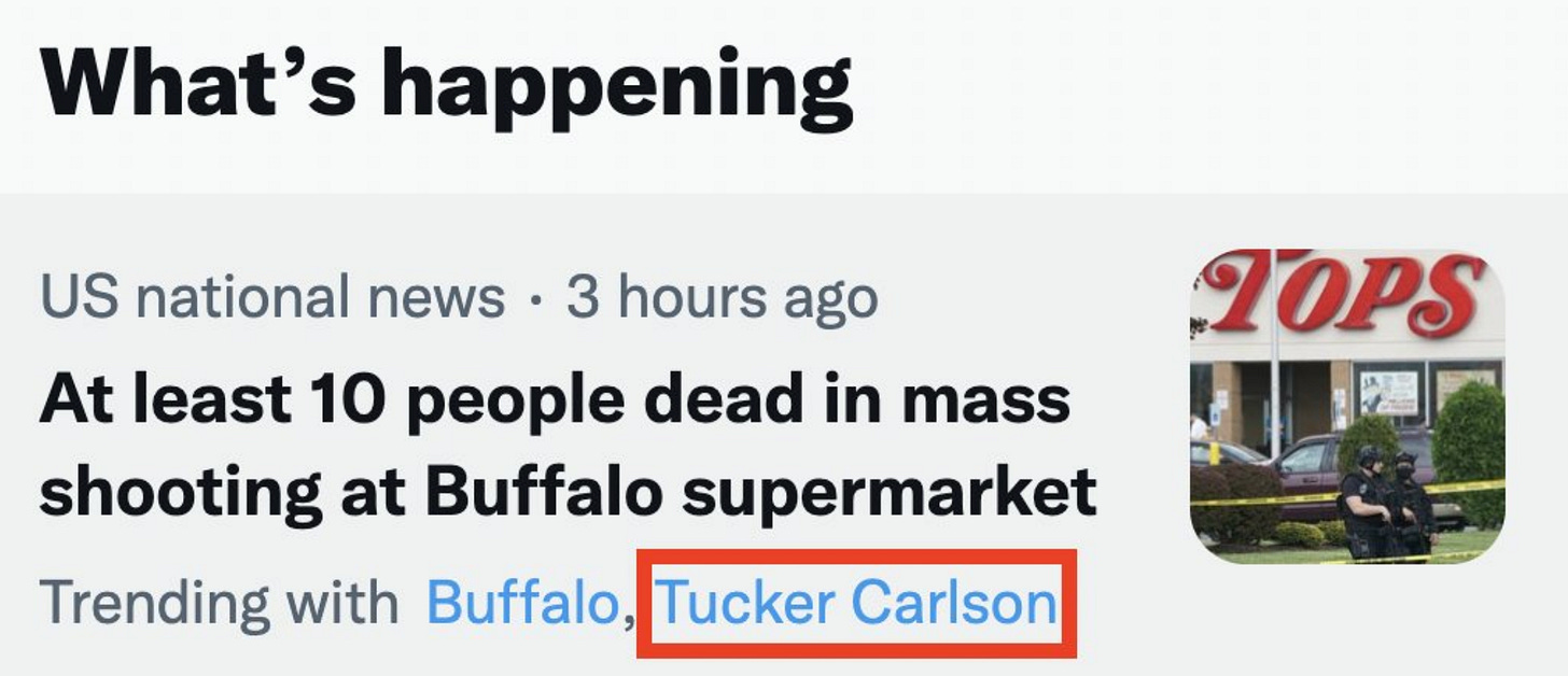 Within literally an hour of the news of this murder spree in Buffalo — far too little time for anyone to have even carefully read all or most of Gendron’s manifesto, and with very little known about his life or activities — much of the corporate press and liberal pundit class united to reveal the real culprit, the actual guilty party, behind this murder spree: Fox News host Tucker Carlson. So immediate and unified was this guilty verdict of mob justice that Carlson’s name trended all night on Twitter along with Buffalo and Gendron.