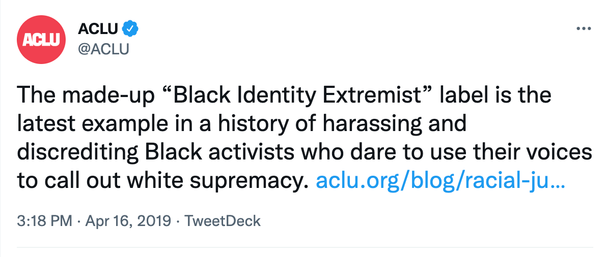 “The made-up ‘Black Identity Extremist’ label is the latest example in a history of harassing and discrediting Black activists who dare to use their voices to call out white supremacy,” claimed the ACLU in 2019. PBS quoted a lawyer for an advocacy group as saying: “We’re deeply concerned about the FBI’s ‘black identity extremist’ designation. This is mere distraction from the very real threat of white supremacy…There is no such thing as black identity extremism.” The same year, The Intercept published an article headlined “The Strange Tale of the FBI’s Fictional ‘Black Identity Extremism’ Movement,” which claimed over and over that there is no such thing as black extremism and that any attempt to ascribe violence to this ideology is a lie invented by those seeking to hide the dangers of white supremacy.