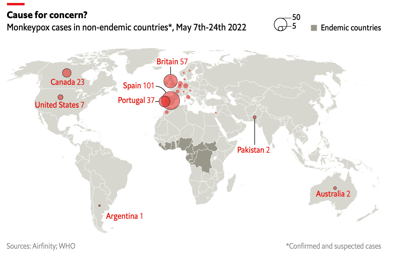 🙈 The Economist ran a story yesterday headlined, “Where is monkeypox spreading fastest?” The story provided a helpful heat map showing where monkeypox is spreading most. It’s also a helpful guide for the sexually adventurous. Spain looks to be the networking hot spot just now.
