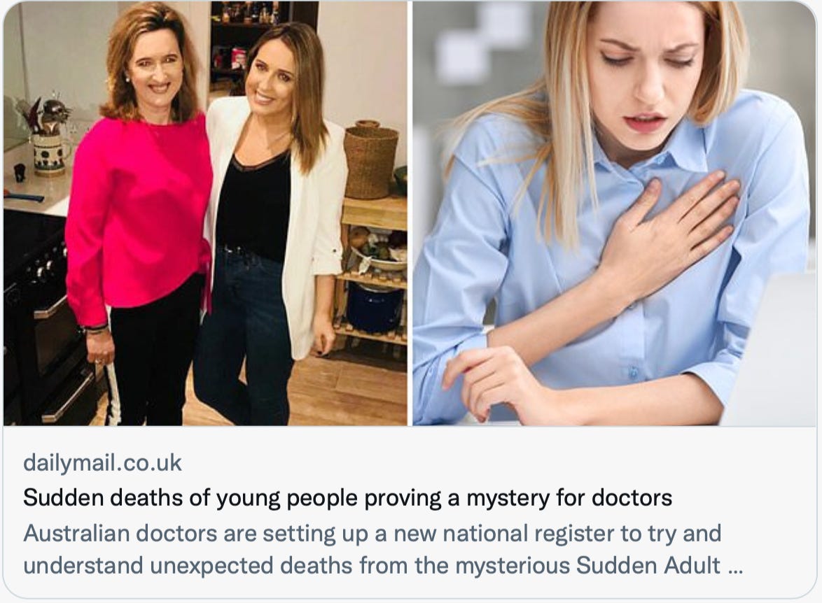 An article two days ago in the UK Daily Mail was headlined, “Healthy Young People Are Dying Suddenly and Unexpectedly From a Mysterious Syndrome – as Doctors Seek Answers Through a New National Register.”