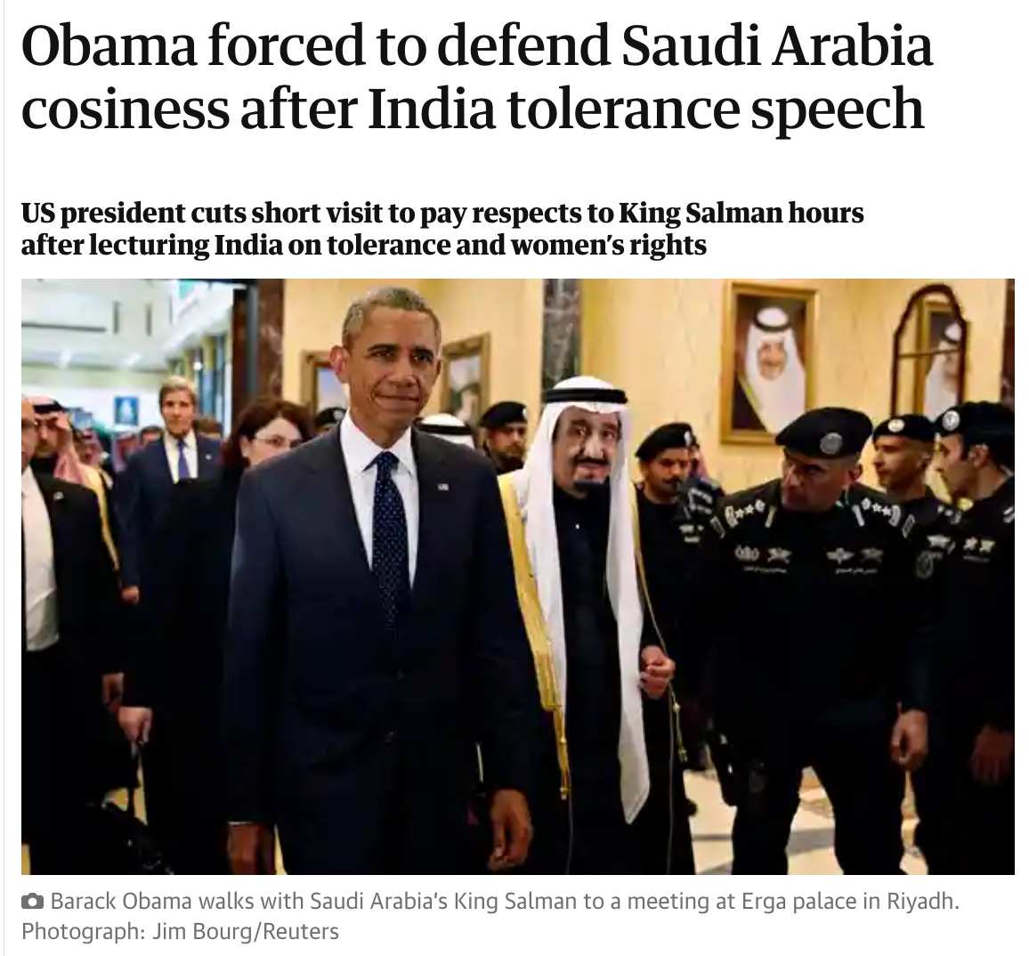 That Joe Biden was masquerading as some sort of human rights crusader who would sever ties with the despotic regimes that have long been among America’s most cherished partners was inherently preposterous. As Obama’s Vice President, Biden was central to that administration’s foreign policy which was driven by an embrace of the world’s most barbaric tyrants. So devoted was Obama to the U.S.’s long-standing partnership with Riyadh that, in 2015, he deeply offended India — the world’s largest democracy — by abruptly cutting short his visit to that country in order to fly to Saudi Arabia, along with leaders of both U.S. political parties, to pay homage to Saudi King Salman upon his death. Adding insult to injury, Obama, as The Guardian put it , boarded his plane to Riyadh “just hours after lecturing India on religious tolerance and women’s rights.”