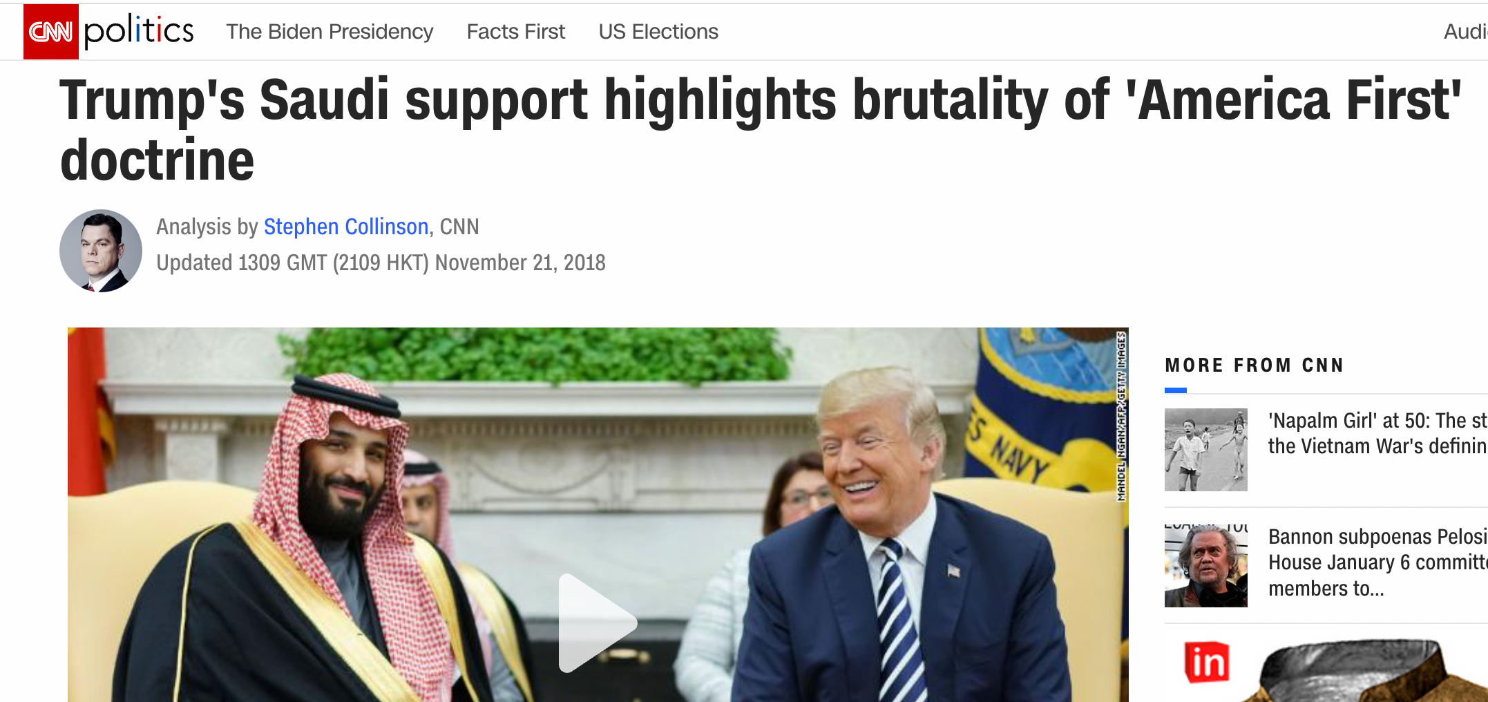 The life-long Eurocrat, former Swedish Prime Minister Carl Bildt, lamented what he described as Trump’s worldview: “if you buy US weapons and if you are against Iran – then you can kill and repress as much as you want.” CNN published an analysis by the network’s White House reporter Stephen Collinson— under the headline: “Trump’s Saudi support highlights brutality of ‘America First’ doctrine” — which thundered: “ Refusing to break with Saudi strongman Mohammed bin Salman over the killing in the Saudi consulate in Istanbul, Trump effectively told global despots that if they side with him, Washington will turn a blind eye to actions that infringe traditional US values.” Trump’s willingness to do business with the Saudis, argued Collinson, “represented another blow to the international rule of law and global accountability, concepts Trump has shown little desire to enforce in nearly two years in office.”