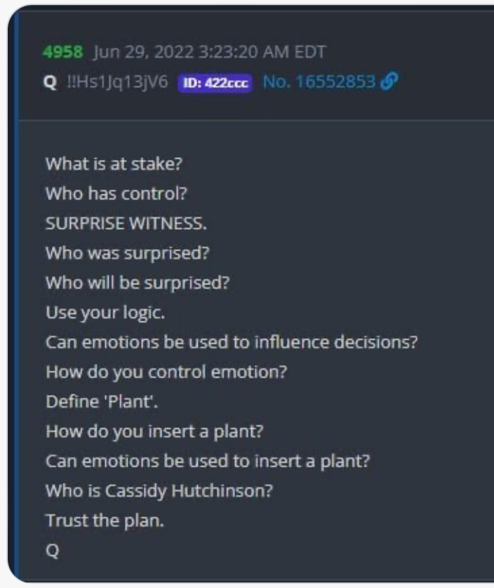 So, early in the morning yesterday, before Cassidy’s testimony, the Q account posted a cryptic message mentioning her: