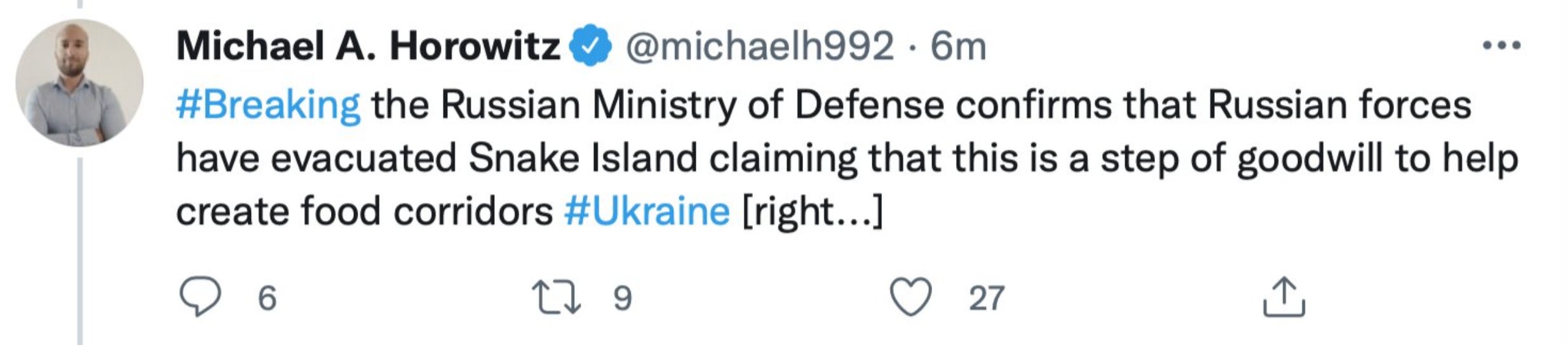 🚀 The Ukrainians have finally blown the Russians off tiny Snake Island, which media now reports is a “key” strategic location, a fact they completely failed to mention during the last two months of Russian occupation.