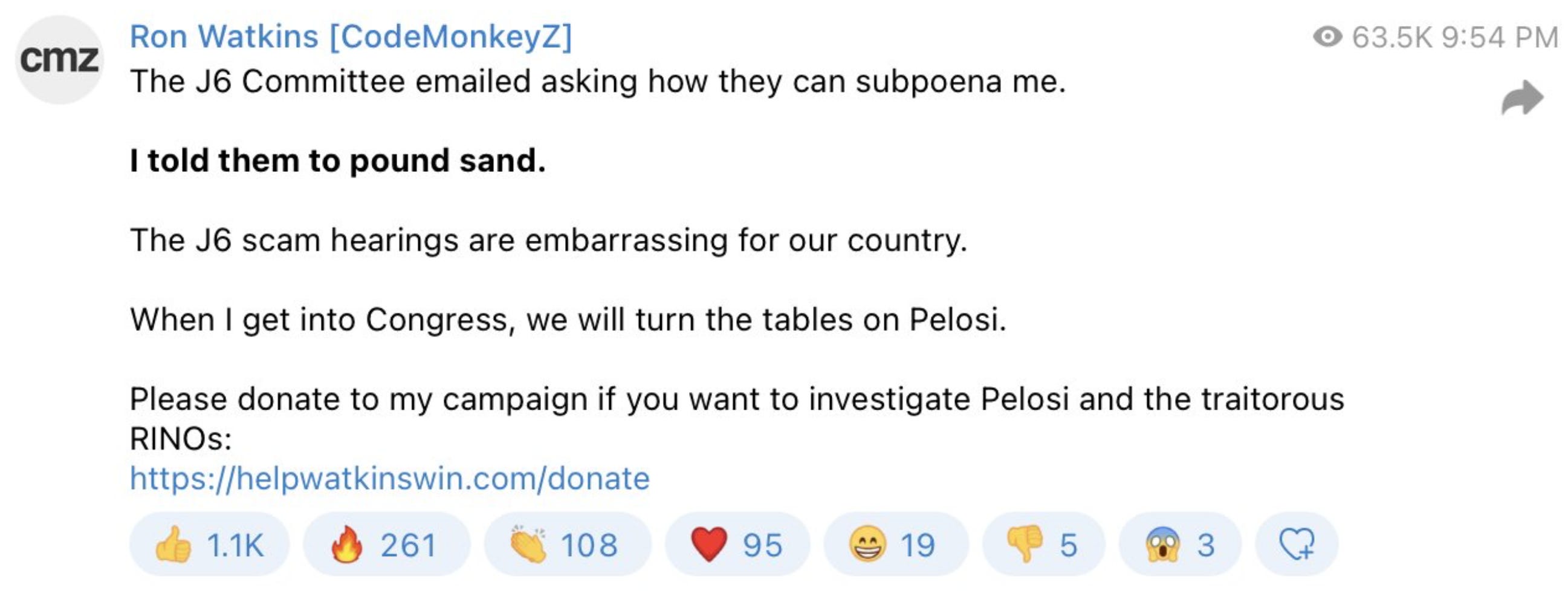 And then the story got even crazier! It’s not just online Q fans speculating about Q knowing or predicting that Hutchinson was a plant. The House Committee emailed the guy who runs the online site where Q posts, Ron Watkins, asking him if he’d accept service of a subpoena: