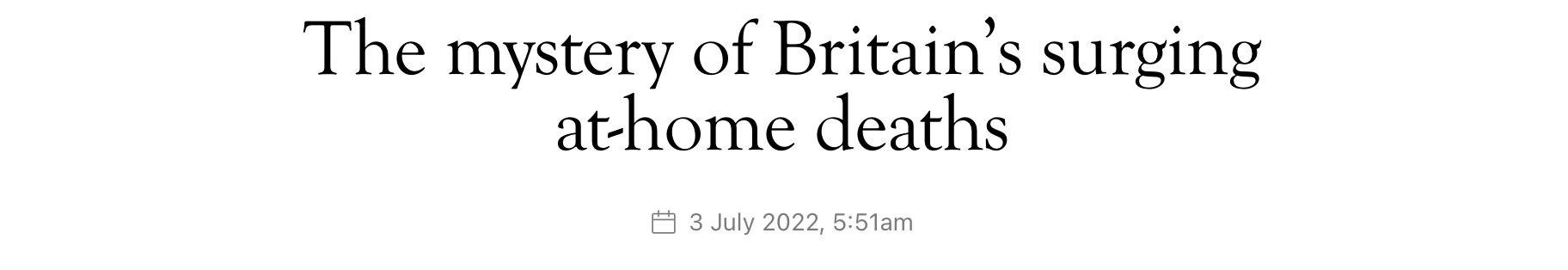 She also pointed out things are getting worse, not better. “[O]verall deaths [are] rising even though Covid deaths have been falling.” A UK Spectator data analyst observed that, strangely, AT-HOME deaths make up the largest cohort: the number of at-home deaths is +31.5% above the five-year average, compared with +12.1% above average in hospitals and +10.3% in care homes.