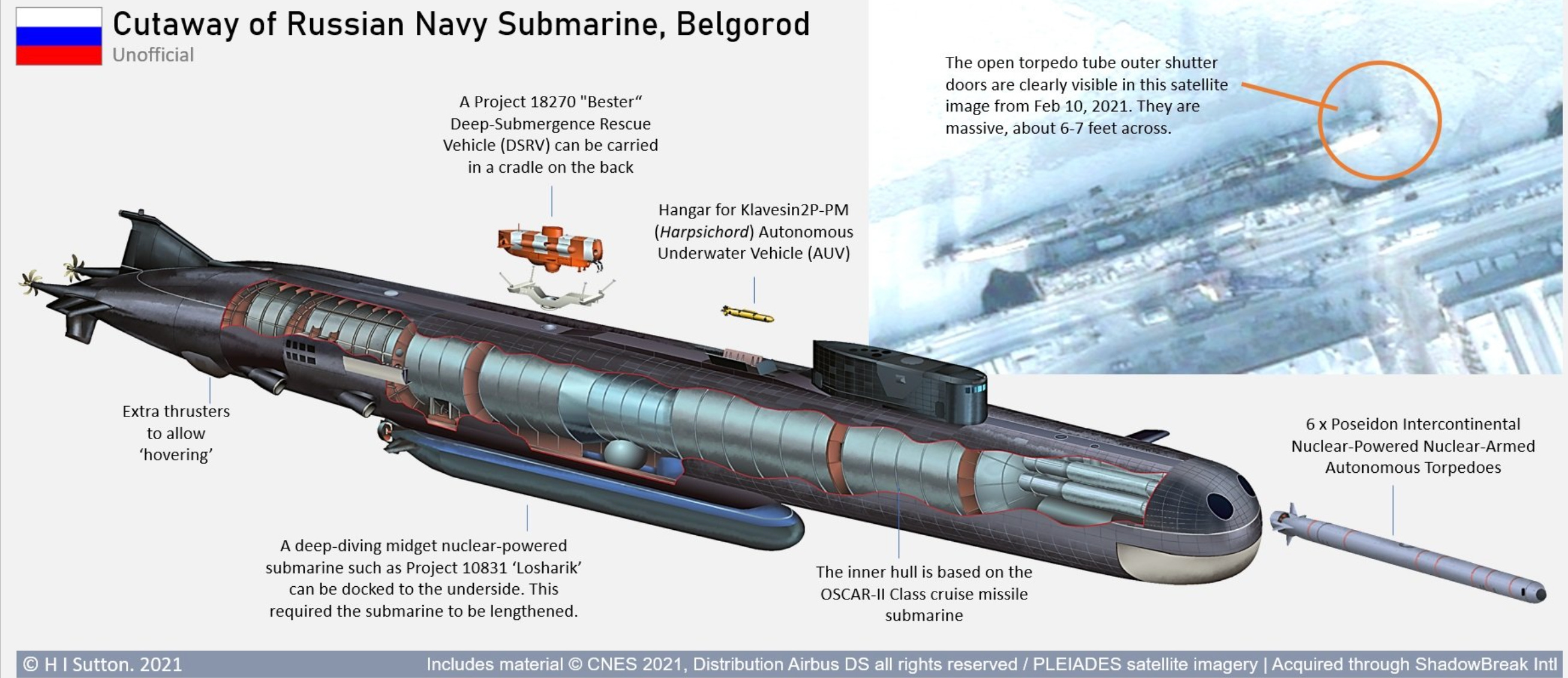 Now connect this dot: yesterday, Russia launched its brand-new super-gigantic, high-tech nuclear submarine, the Belgorod. It includes a number of unique features, like 2 megaton nuclear drone torpedoes that can race around at 130 miles per hour. Torpedos, not missiles. The torpedoes are designed to explode UNDER WATER with the force of 10,000 Hiroshima’s, creating a massive tsunami.