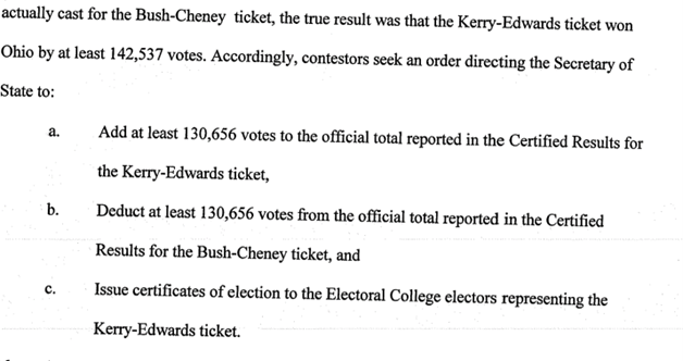 Then they requested votes be added to Kerry-Edwards and that the electors for Kerry-Edwards be certified instead of those for Bush, as seen in the screenshot below. Id. at 35.