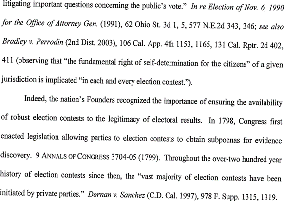 They also wrote: “For over two hundred years, one of the strengths of our democracy has been that citizens may question the results of an election.” Id. at 2. They argued it was strongly in the public interest to allow election contests and discovery in them. Id. at 2-3. Indeed, election challenges are crucial.
