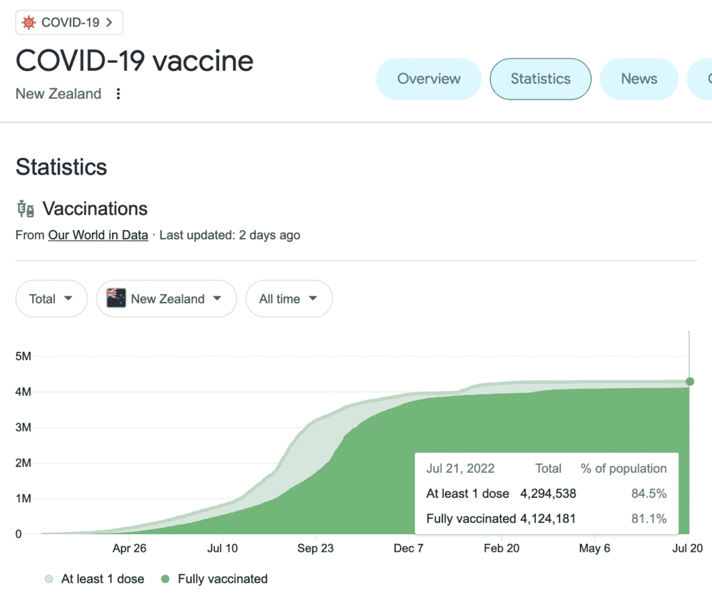 - New Zealand’s population is 84.5% vaccinated (81.1% “fully”) against COVID-19, according to U.S. Centers for Disease Control and Prevention (CDC) data cited by Google.