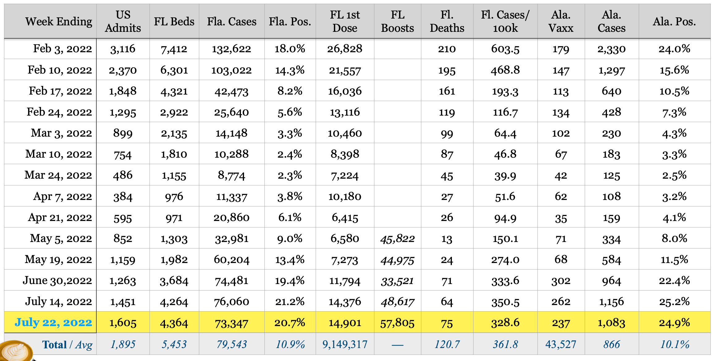 As you can see from today’s chart, it appears the summer covid wave in Florida has peaked and is now heading back down. Deaths and hospitalizations lag case counts, so we can expect them to remain elevated for a couple more weeks. And as you can see, none of the stats in this wave ever approached levels even from the Spring Omicron wave, never mind last Fall’s Delta wave. So, despite the corporate media experts’ gloomy predictions, it appears that herd immunity is a thing after all.