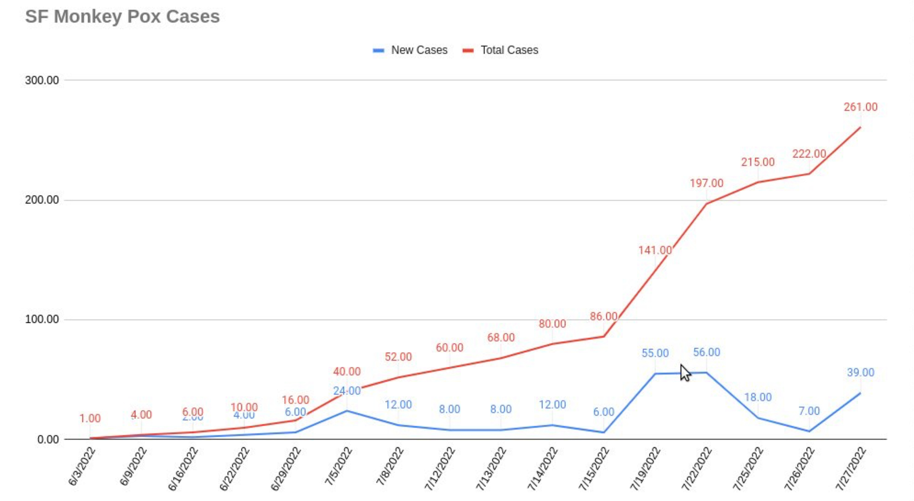 All things being even, San Fransisco’s cases are still in pretty small numbers, at least relative to other recent disease emergencies. And there’s no scary trend lines showing. The blue line on the chart below is the “new cases” line, and while it is elevated, it’s not spiking or anything. Not yet at least.