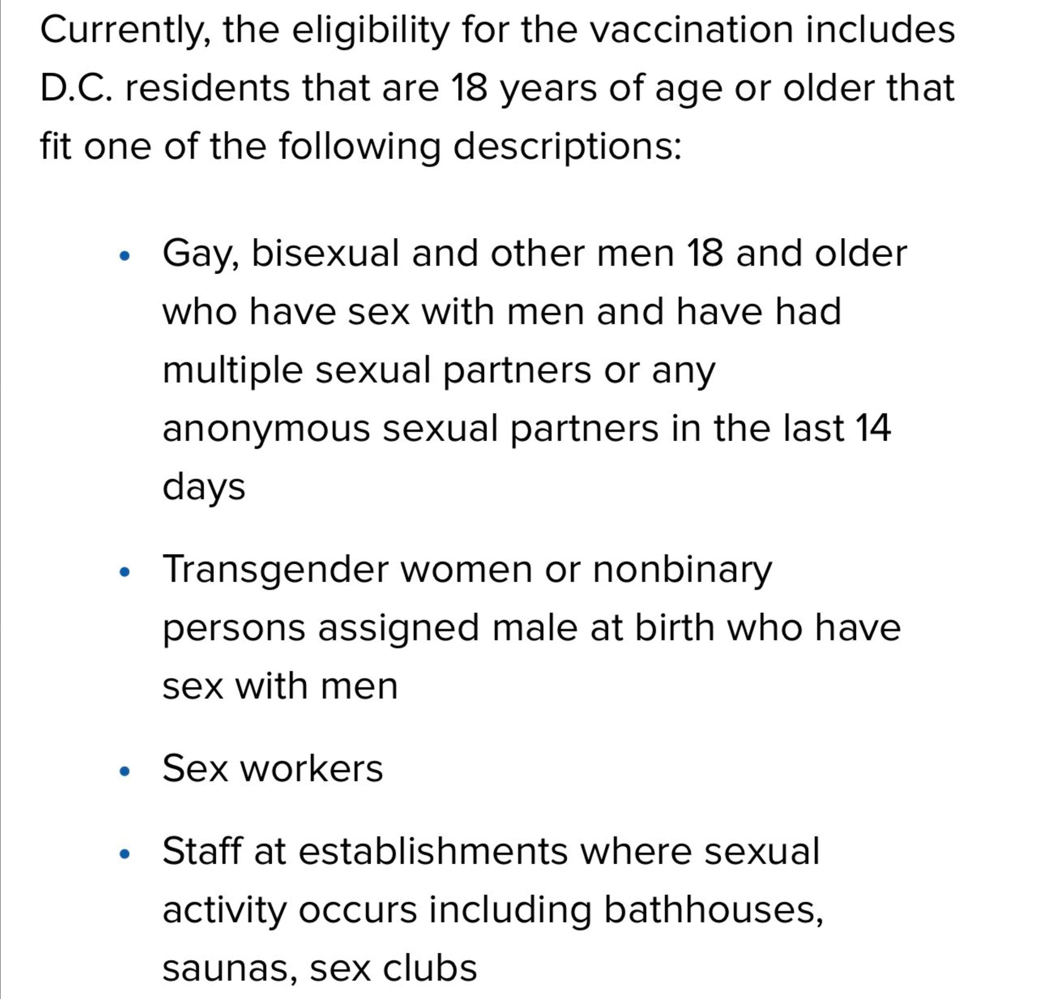 Every single one of the groups defined on the DC vaccination requirement includes the word, “sex.” So, maybe TV doctors and media “monkeypox experts” say it’s not an STD, but everyone else seems to think it is.