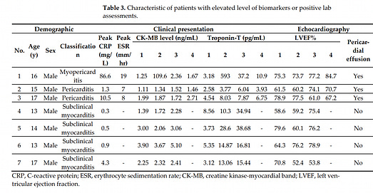 I will get right to the point. The authors ran a bunch of tests on kids (202 boys, 99 girls) aged 13-18 who got the 2nd dose of Pfizer, after getting the first dose without adverse events. The EKG changes in the pre-print are not the story. The story are rates of cardiac biomarkers and how often they are elevated. 3 patients had chest pain and biomarker elevation; 4 patients had no chest pain but elevated cardiac biomarkers. These were all in boys.