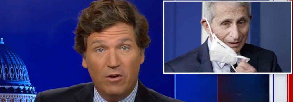 Tucker flatly accused Fauci of helping create covid and then trying to cover it up: “Tony Fauci covered up evidence that HE — Tony Fauci — helped create that virus in the first place.”