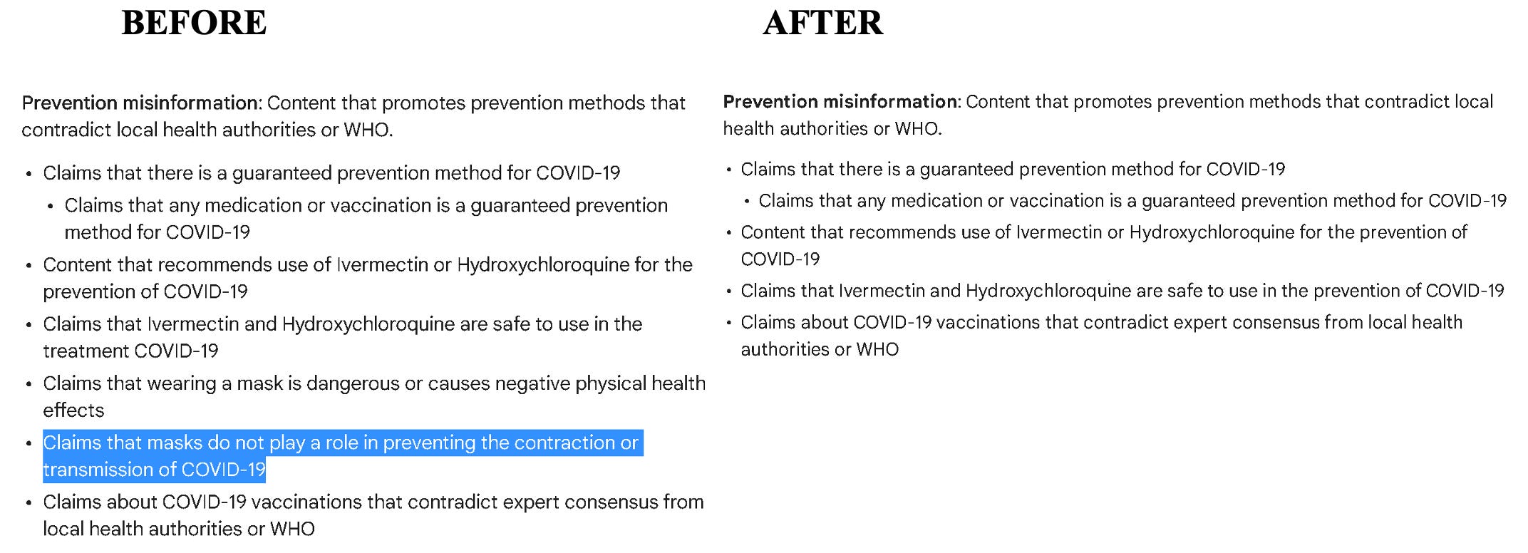 🔥 Ding, dong, Fauci’s dead, and masks are dying. While I languish in Facebook jail for ANOTHER 30 days, YouTubers just got a reprieve. The platform recently slid a stealth update into its covid policies, removing the bans on claims that masks don’t work. Gosh. Here’s the before / after: