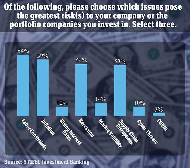 The Stifel Financial survey also showed businesses think labor constraints, inflation, supply chain disruptions and the recession are the biggest threats to their profitability. Guess which threat ranked lowest on their concerns?