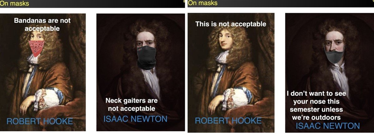 “Masks are required AT ALL times in PHYS 253. Here and in your labs. It is not pleasant, but it is for your health and safety, my health and safety, and the health and safety of your friends and colleagues. If you do not follow this requirement, you will be asked to leave,” he wrote in the course syllabus, a copy of which was obtained by YAF and which also featured pictures of famous historical figures wearing face burkas, a highly esteemed fashion symbol of the 21st century American left.