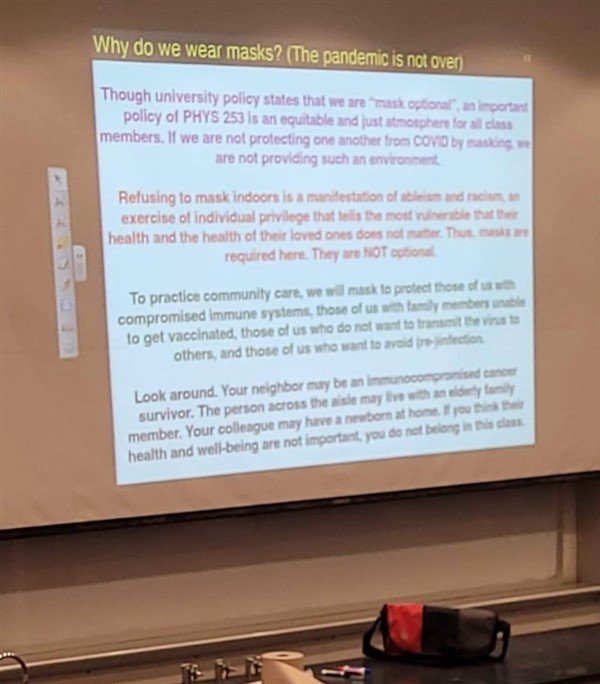 “Refusing to mask indoors is a manifestation of ableism and racism, an exercise of individual privilege that tells the most vulnerable that their health and the health of their loved ones do not matter. Thus, masks are required here. They are NOT optional,” read a message from Adelman seen in a photo of a projector screen from one of his classes.