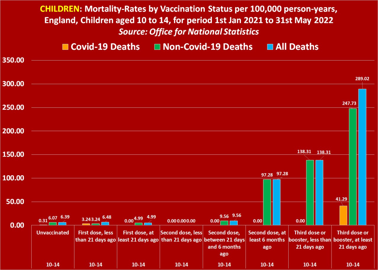 Exposé News charted the report’s horrifying data on outcomes in children. Put simply: vaccinated kids in Britain are astronomically more likely to die from covid or from any cause than unvaccinated kids. WAY more likely.