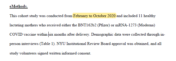 This study was conducted from February to October 2021 (initially reported as February to October 2020; more on that in a moment), and included only 11 lactating women, 5 of whom received the Moderna vaccine and 6 of whom received the Pfizer vaccine. The comparison was made between their pre-vaccine breastmilk (the control) and post-vaccine breastmilk.