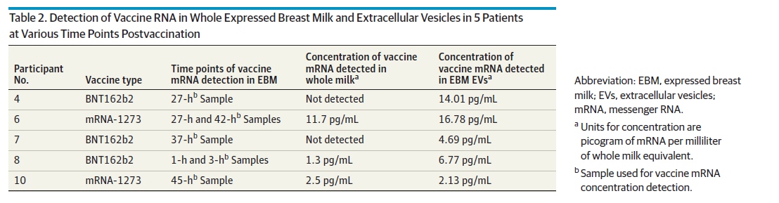 The results? The breastmilk of 5 out of 11 women tested had detectable COVID-19 vaccine mRNA in their breastmilk. For those keeping score, that is 45% – nearly half – of the study group.