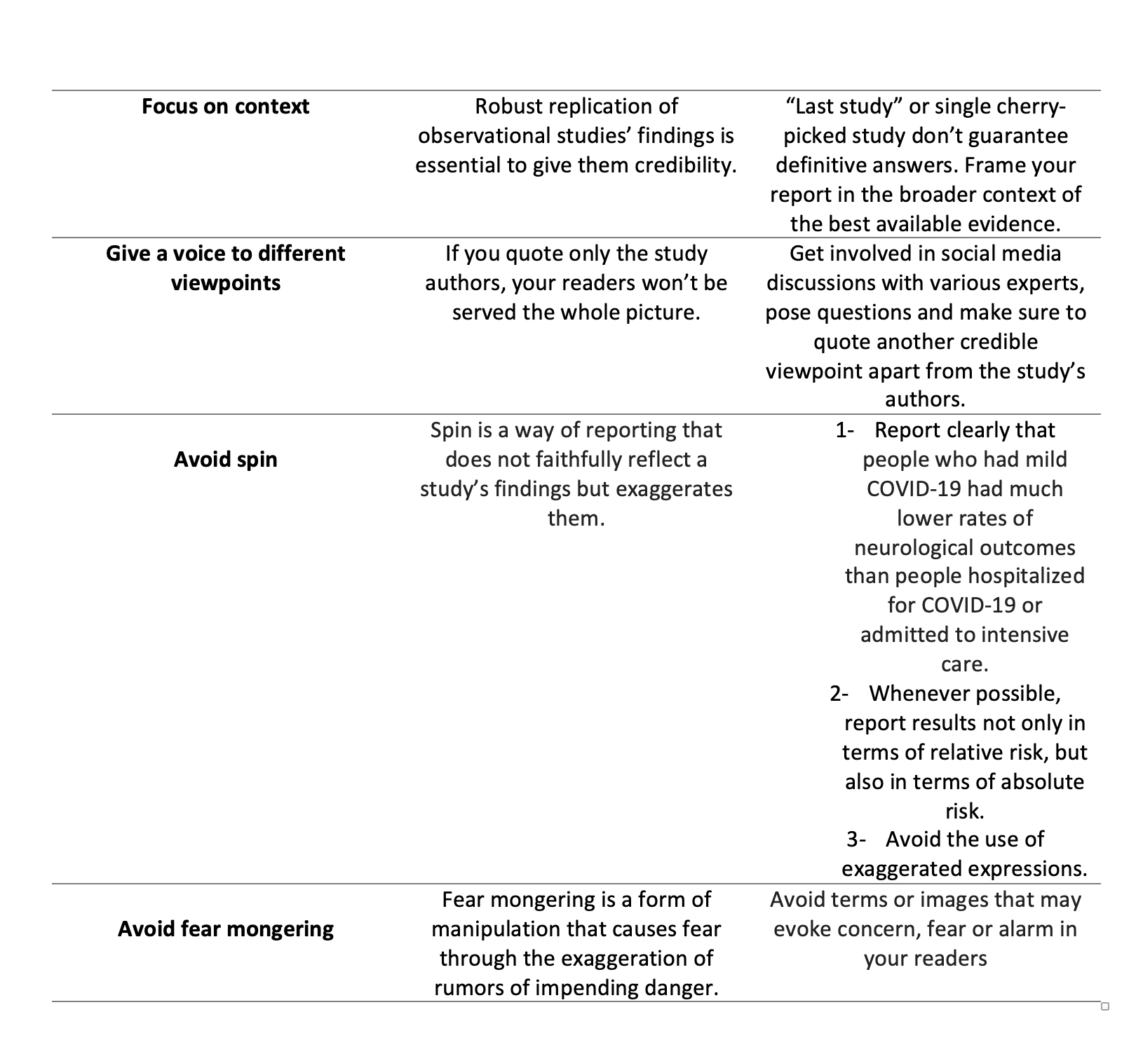 While writing your article, you should stay away from spin, which is a way of reporting news that exaggerates a study’s findings. In our case study, for example, people who had mild COVID-19 had much lower rates of neurological outcomes than those hospitalized for COVID-19 or admitted to intensive care. This gradient should be clearly reported.