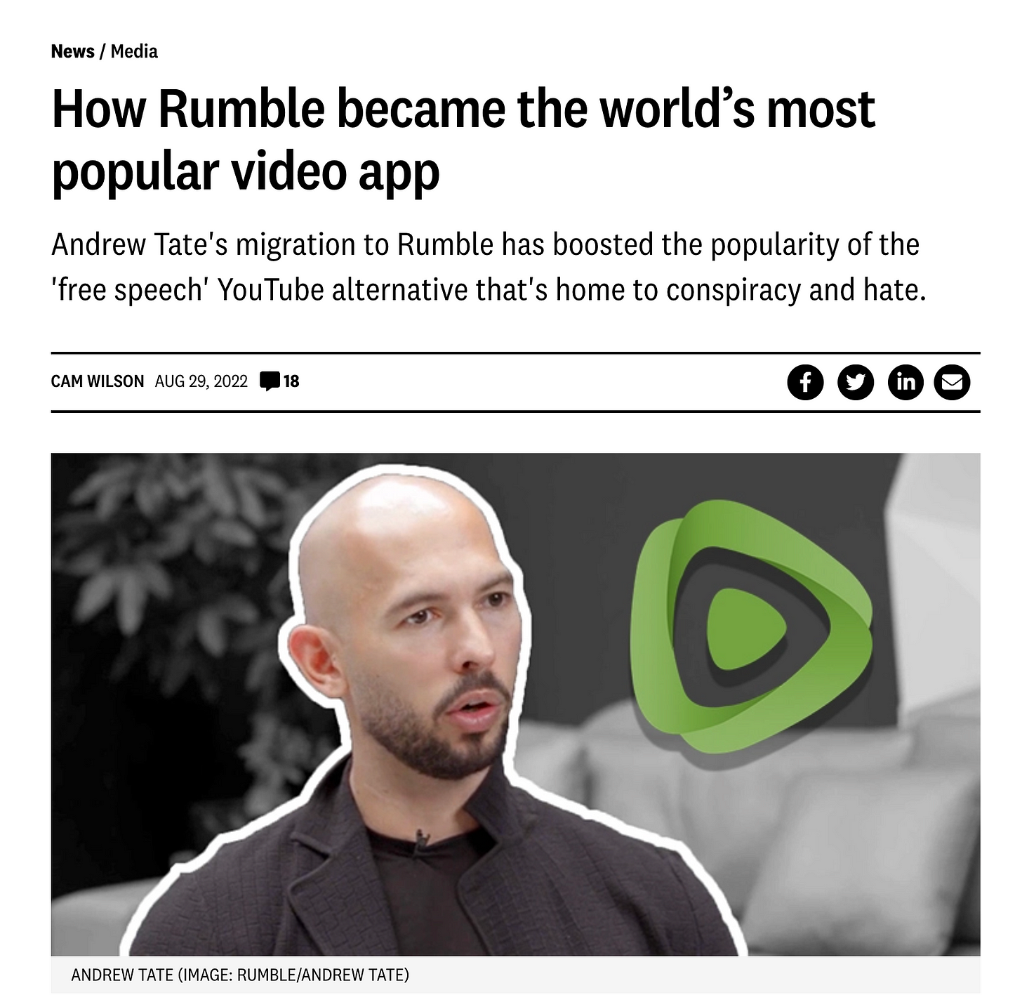 Rumble in particular has been the target of intense attacks — in part because it agreed to allow RT to broadcast on its platform in order to protest the EU’s outlawing of that network and thus incurred the wrath of the Russia-obsessed corporate media, but also because it has experienced massive growth largely as the result of growing anger toward Big Tech censorship. Rumble has begun attracting not only political commentators banished in unison by Big Tech — such as the recent banning Andrew Tate, who promptly moved his large audience to Rumble — but also cultural commentators and Gen Z personalities increasingly angry at the repressive climate imposed by Google on its YouTube platform. This is driving more and more growth to the platform, which in turn is causing establishment media corporations to devote more and more energy to disparaging it.