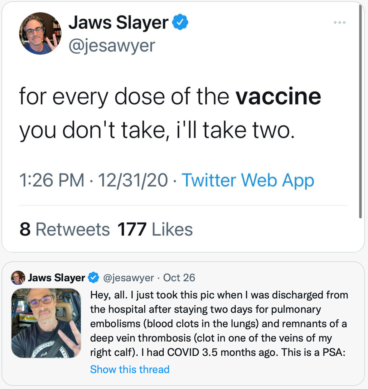 💉 Please keep videogame studio director J. E. Sawyer in your thoughts today, as he’s struggling with baffling, sudden and unexpected blood clots throughout his body. The good news though is that, since he’s alway been a cheerleader for the jabs, he’s protected from covid. Probably.