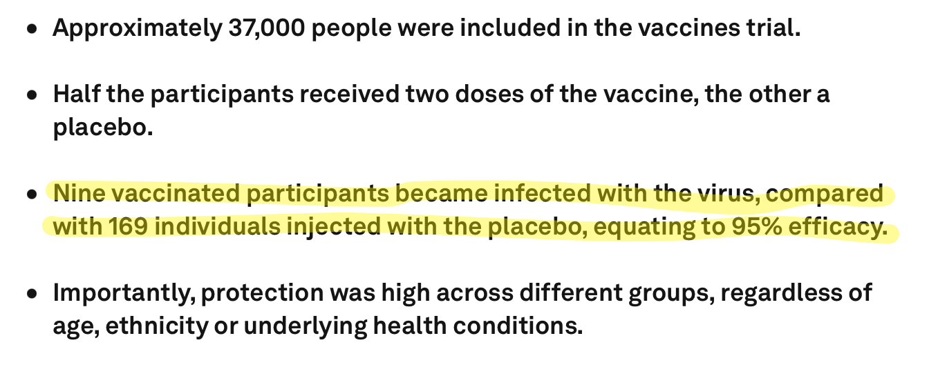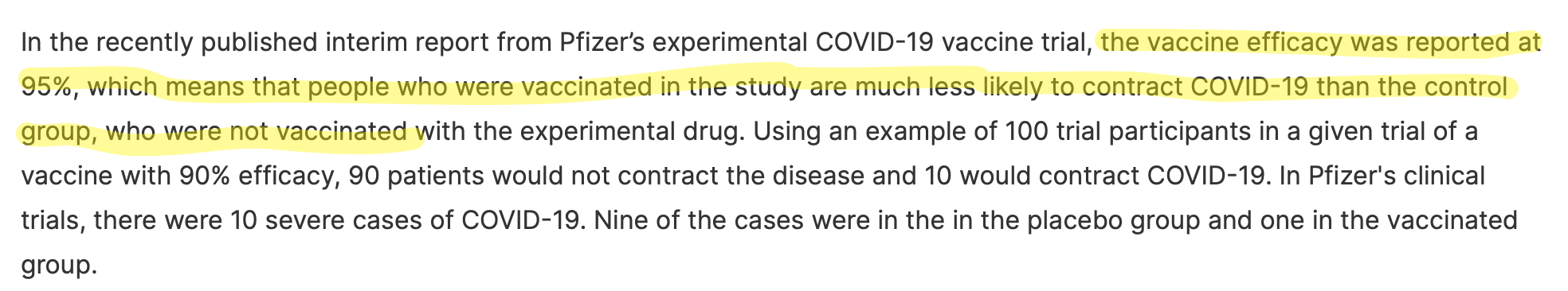 But, maybe it was just the WEF’s vaccine experts who read Pfizer’s results this way? Nope. Everybody did. In a November 2020 article titled “What do the efficacy results of Pfizer’s clinical trial mean?”, Medeen’s Health-Desk, billed as “public health experts in service of journalism,” described Pfizer’s trials like this:
