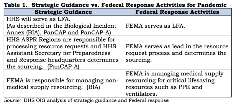 The table below is from a September 2021 report from the Office of Inspector General (OIG) of the Department of Homeland Security, “Lessons Learned from FEMA’s Initial Response to COVID-19.” This document stresses that “The PanCAP-A did not address the changes that ensued when FEMA was designated the LFA. Furthermore, FEMA (and HHS) did not update the PanCAP-A or issue interim guidance addressing the changes in critical roles and responsibilities for each agency.” (p. 11)