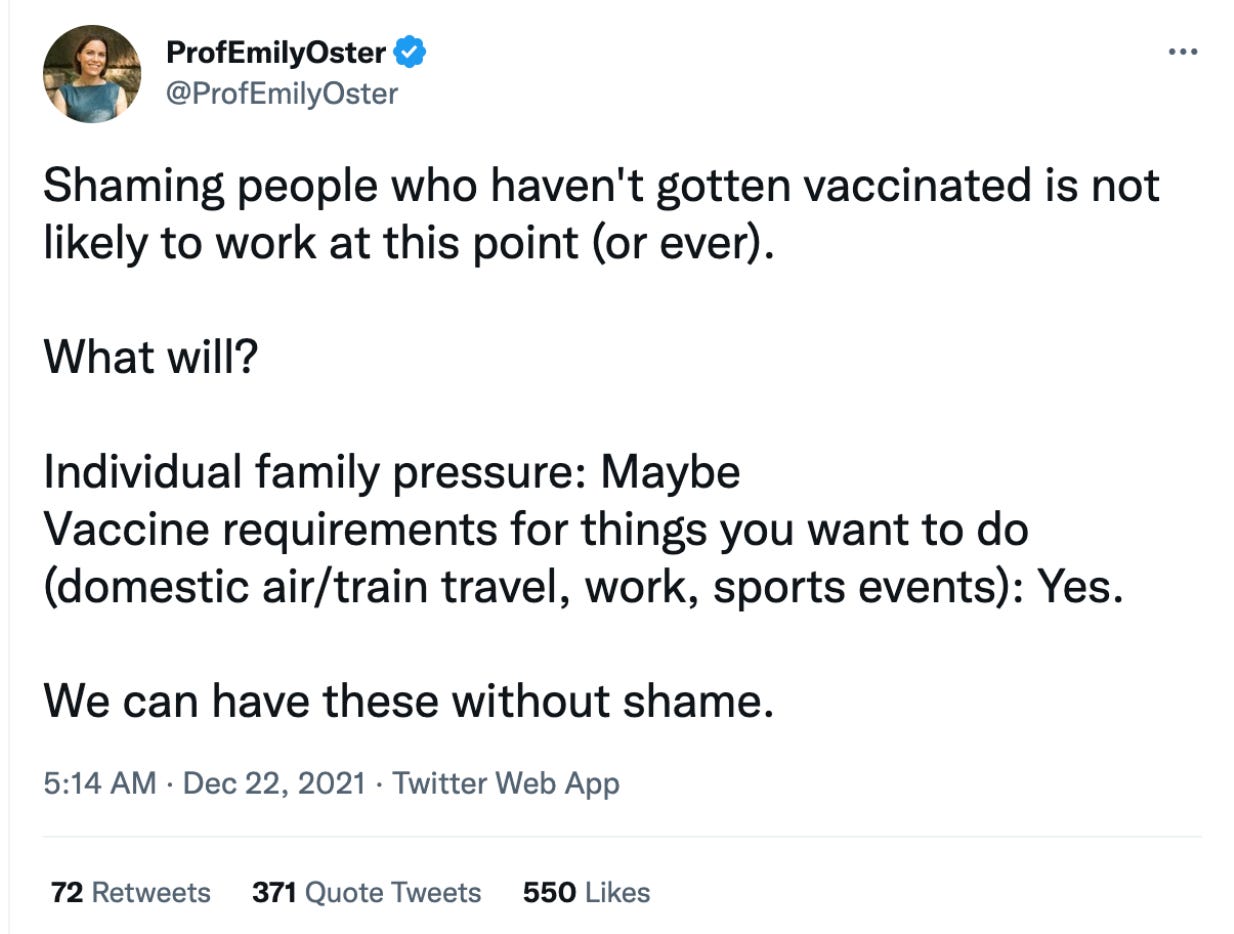Hart’s op-ed pushed back on Professor Oster’s ill-timed call for ‘covid amnesty,’ which Hart accurately labeled “a pre-emptive request for forgiveness.” Hart’s not letting Oster hide behind her Jane-come-lately support for school reopenings, either. He reminded readers about Oster’s disgusting December 2021 tweet: