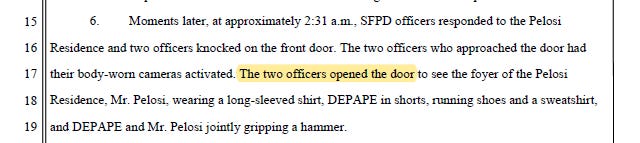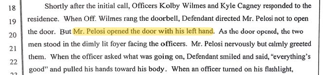 After it muscled into the otherwise local case, the United States Department of Justice contradicted earlier reports from officers on the scene, and began insisting that the two San Fransisco police officers opened the door — not Pelosi. That contradicted the earlier version from the District Attorney’s office, which had reported “Mr. Pelosi opened the door with his left hand.”