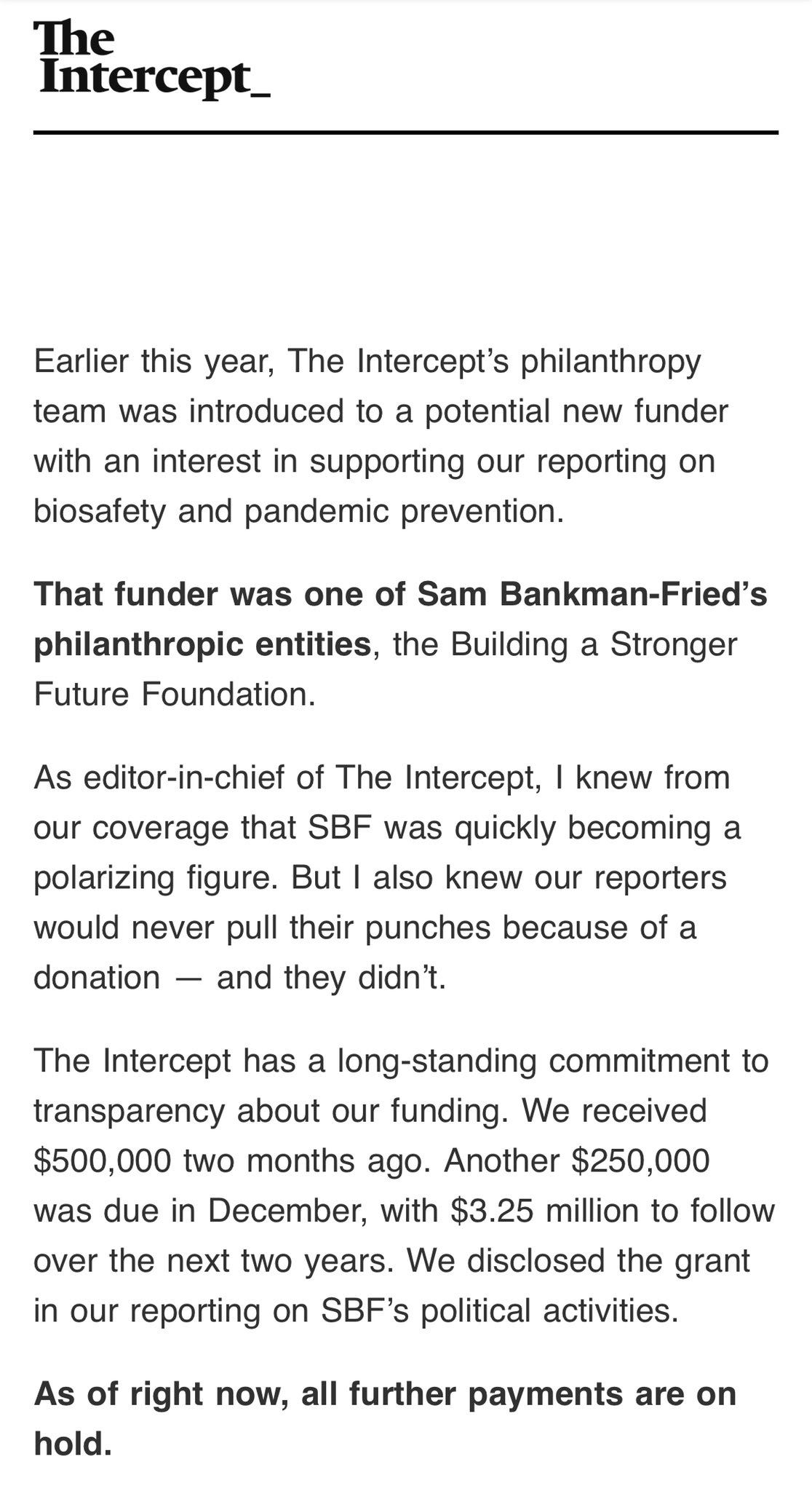 Sometimes you have to get ahead of the bad news. Lefty news outlet The Intercept was forced to make an embarrassing admission this week — it had been accepting “grants” from one of FTX’s shady “philanthropic entities,” allegedly to support The Intercept’s mighty fine work on “biosafety and pandemic prevention.”