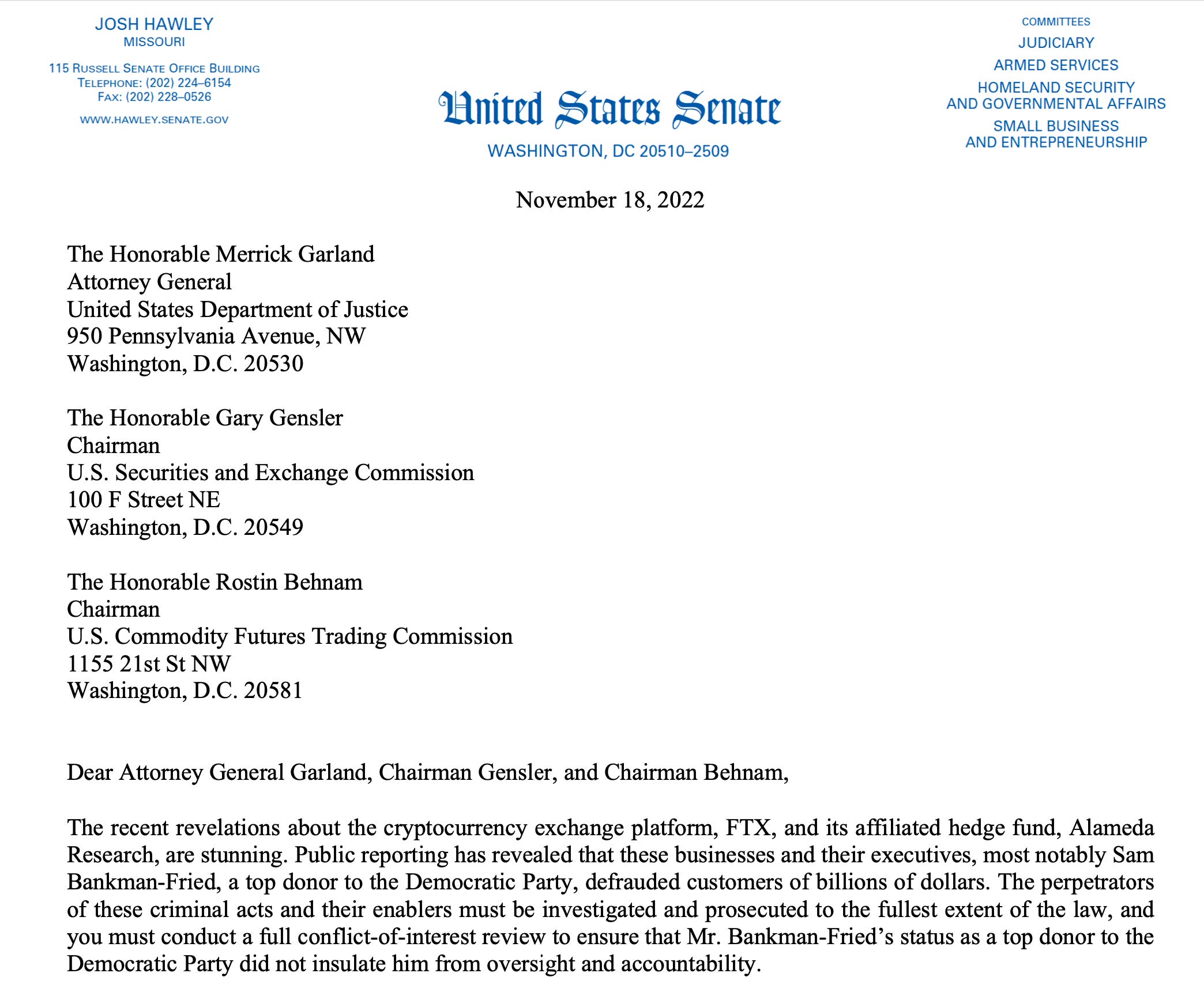 🔥 On Thursday, Senator Josh Hawley asked the DOJ, the SEC, and the Commodity Futures Trading Commission (CFTC) for all information and communications relating to FTX.