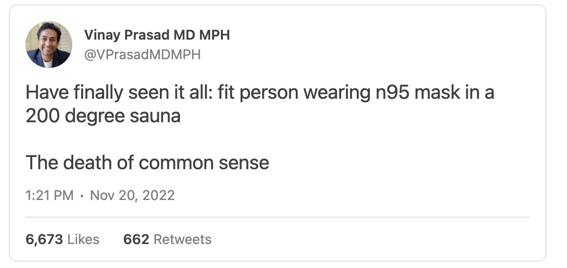 But the real stupid choice was pushing masking without robust cluster RCT data. That will haunt us for a 100 years. And, wearing a mask in a sauna is not a way to #FollowTheScience or stick it to Trump— you just stick it to yourself and common sense, science and evidence based medicine.