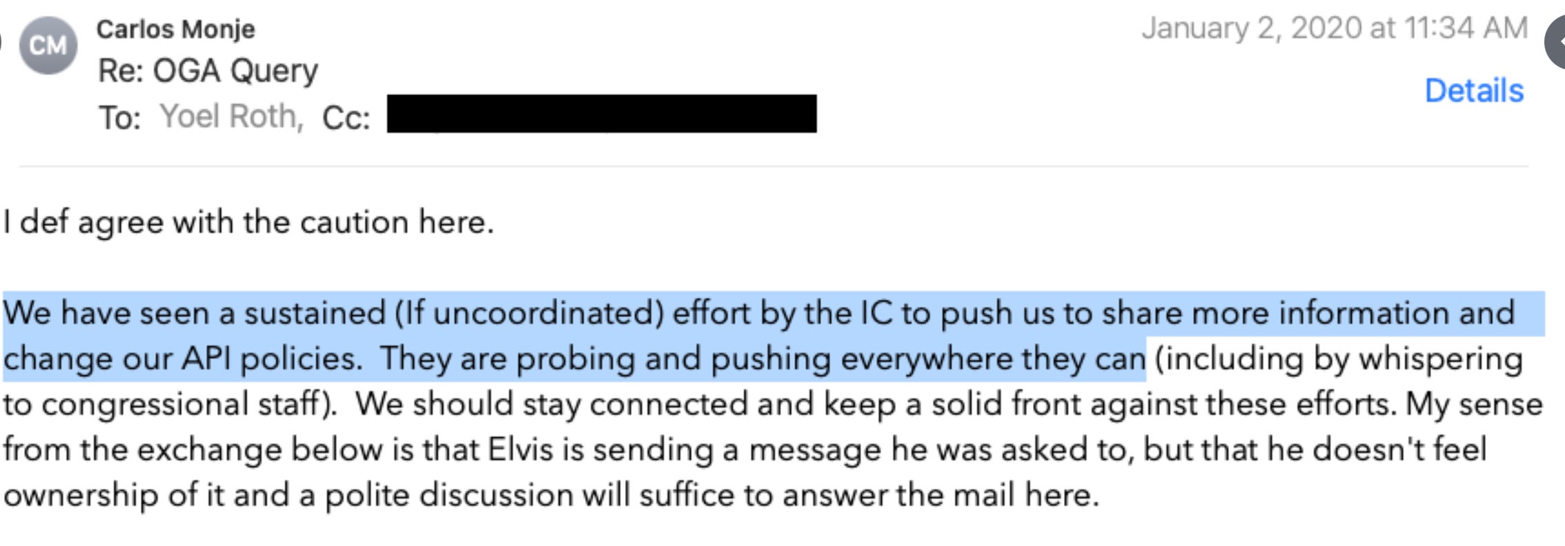 In January of 2020, some Twitter employees expressed concern over FBI Agent Elvis Chan’s intentions and the FBI’s social media dragnet, as seen in this email from Carlos Monje to Yoel Roth, disclosing a “sustained effort by the Intelligence Community to push us to share more information and change our API policies” to allow direct access into Twitter’s database: