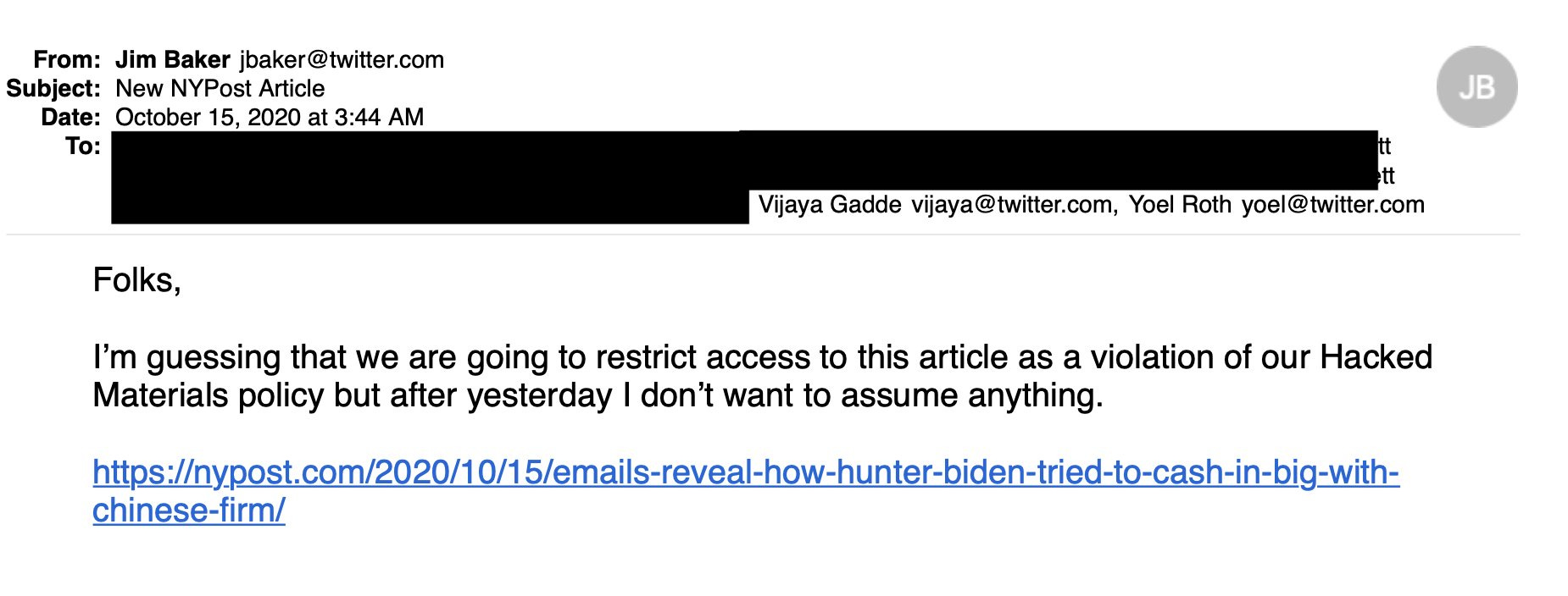 In October 2020 — the month before the election — the Hunter Biden laptop story broke in the New York Post. Almost immediately, Twitter (and other social media companies) banned and locked down discussion about the story, and suspended the New York Post, even though it was a “mainstream” newspaper, lamebrainedly citing some rule about hacking.