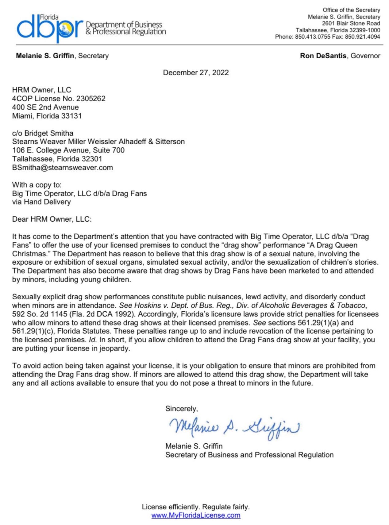 The Department of Business and Professional Regulation (DBPR) is aware of multiple complaints about a sexually explicit performance marketed to children held in Fort Lauderdale on December 26th. The Department is actively investigating this matter, including video footage and photographs from the event.