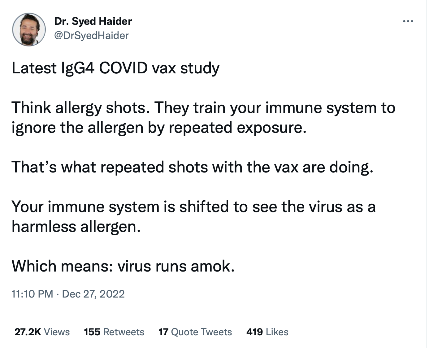 Good morning C&C, it’s the last Wednesday of 2022! Today’s packed roundup includes: the IgG4 study is making waves; bad news for Moderna’s covid treatment drug in two new studies; Canadian study shows no benefit over natural infection offered by five shots; teenage St. Paul hockey player dies from rare brain clots; social media influencer shades the intelligence community; sick Fort Lauderdale Christmas drag show now under investigation; the military mandate finally falls; and TV doctor surprisingly supports military mandate repeal, citing vaxx injuries.