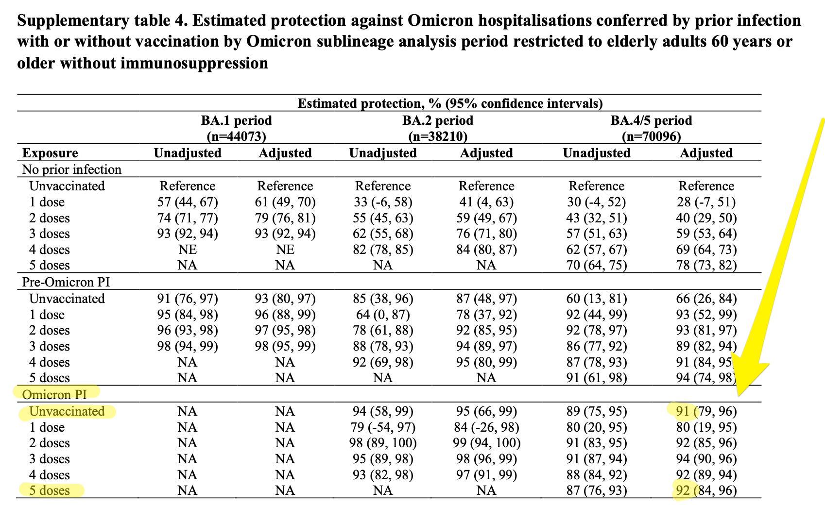 The table showed that the researchers found unjabbed people with Omicron natural immunity were just as protected (91% vs 92%) from hospitalization as previously-infected people with five doses of the mRNA jabs. Or put another way, they found no difference in the rate of hospitalization between unjabbed and quintuple-jabbed people with prior Omicron infections.