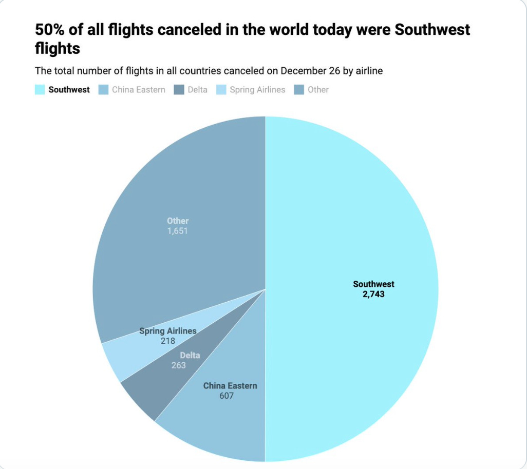 Nobody seems to know why Southwest cancelled so many flights compared to all the other airlines. They’re sticking with “bad weather.” But a clue appeared in one statement blaming the chaos was also due to problems with “scheduling software.” Software the airline has been using for decades.
